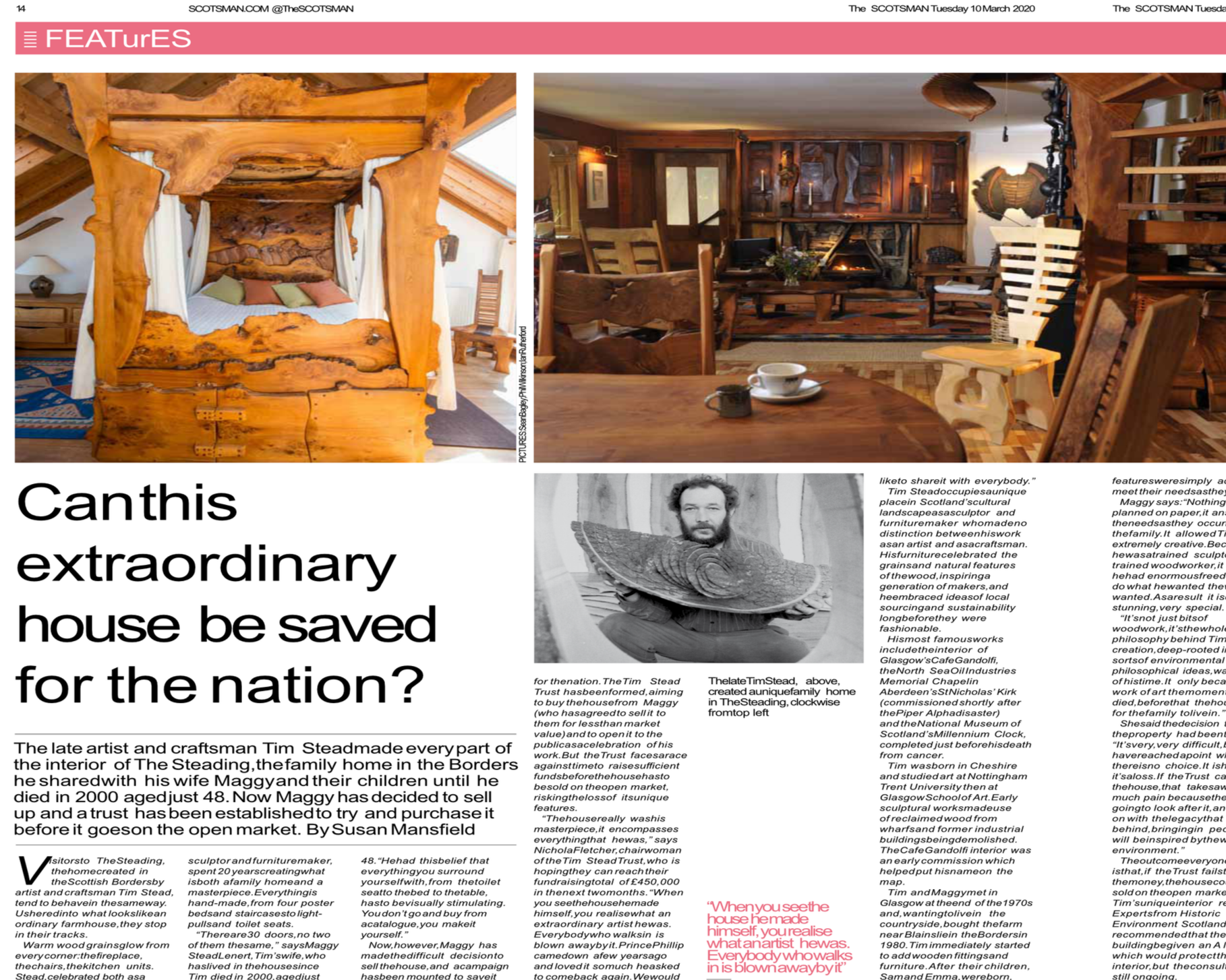 In 2013 The Workshop of Tim Stead was taken over by Maggy’s employees and became the Wood Neuk, now run by Tim’s former apprentice, David Lightly. Much of the huge collection of Tim’s work was held in storage. But what to do about The Steading and its priceless contents? And who would care for Tim’s collection and archive?
