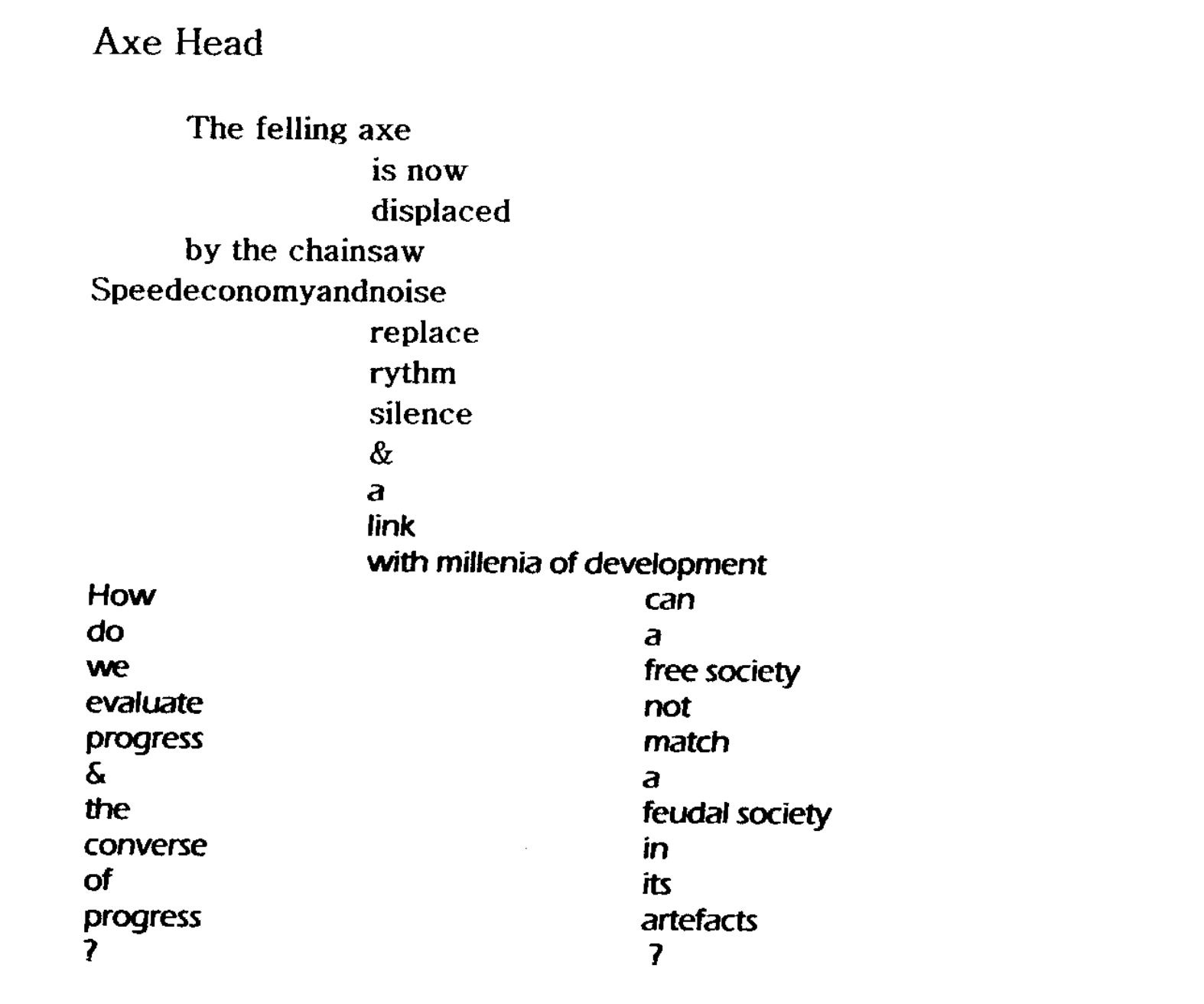 “From January 9th 1986 I have been making one wooden axe head for each day of the year. Each one is made from a native home grown wood, signed and dated. The money exchanged for these wooden axes will be used to plant broad leafed trees. This will be done in several ways, the propagation of seeds to distribute, finding local areas where trees can be planted through farms and local authorities, and to buy land and begin to create a forest.