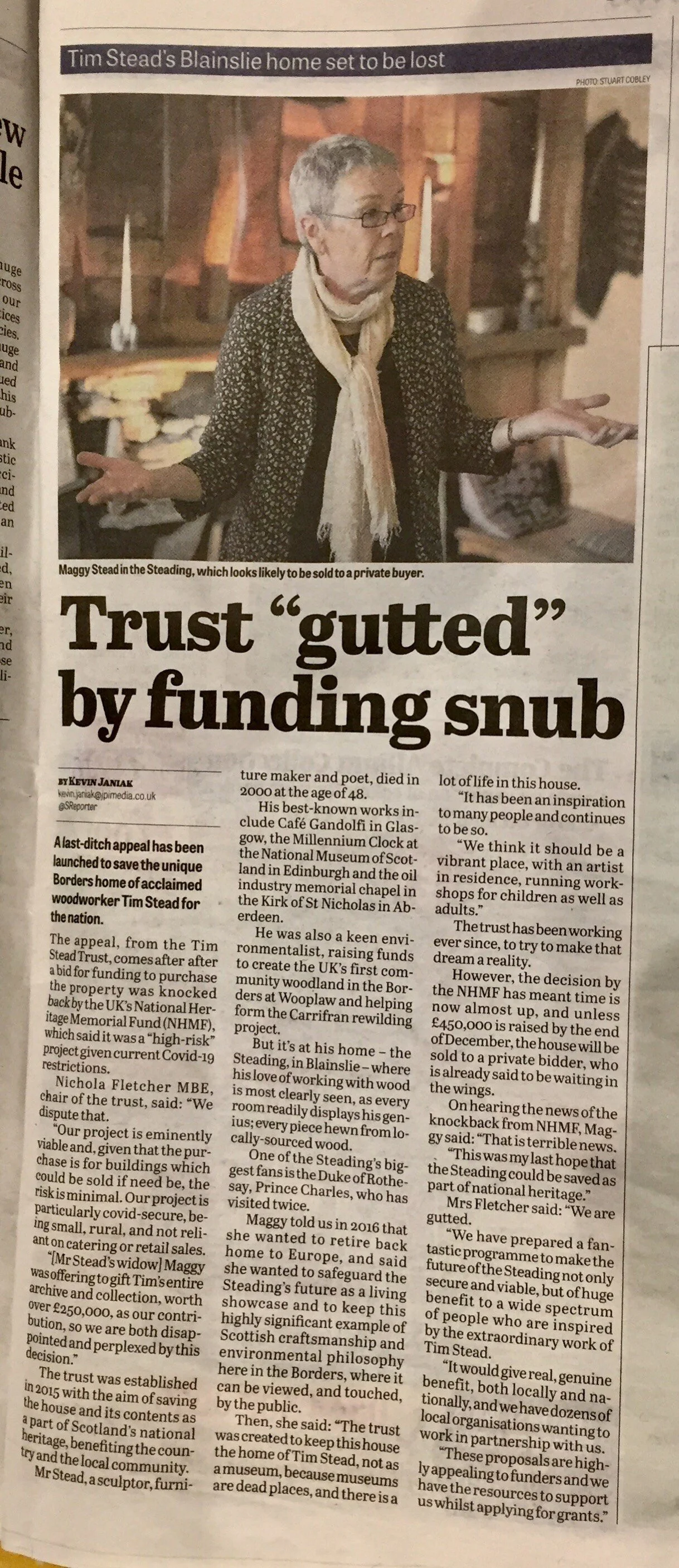 Eventually, in early November, I received a brief email to say that NHMF would not fund our project. No reason given. The end of the road. We all felt stunned and crushed. Maggy said her money had run out; she really would have to put the house on the market. But one trustee said, ‘It’s not over till someone else has bought The Steading.’ So we took a deep breath, wrote the most heart-wrenching press-release we could muster, and then pulled in every media and PR contact we could think of. Off it flew, into the ether. And, despite several people showing an interest in purchasing the building, Maggy bravely took it off the market and prayed for a miracle.